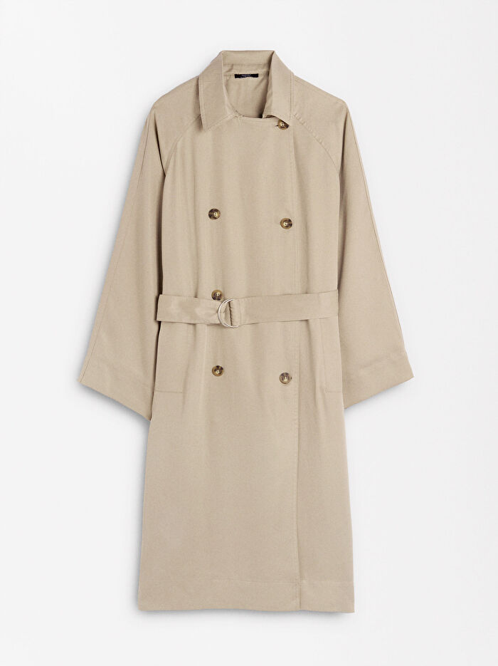 Yan cepli uzun trençkot. Liyosel kumaştan üretilmiştir. Yaka yaka. Uzun kollu. Düğme kapatma. Ayarlanabilir kemer. Model 1,73 m boyundadır ve XS beden giymektedir.