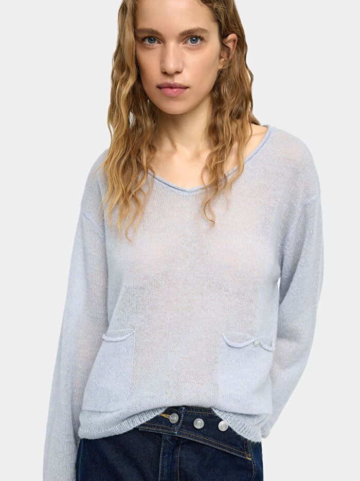 Yün karışımlı, dökümlü kazak. V yaka. Uzun kollu. Düğmeli yan cepler. Model 1.77 m boyunda ve XS-S beden giyiyor.
