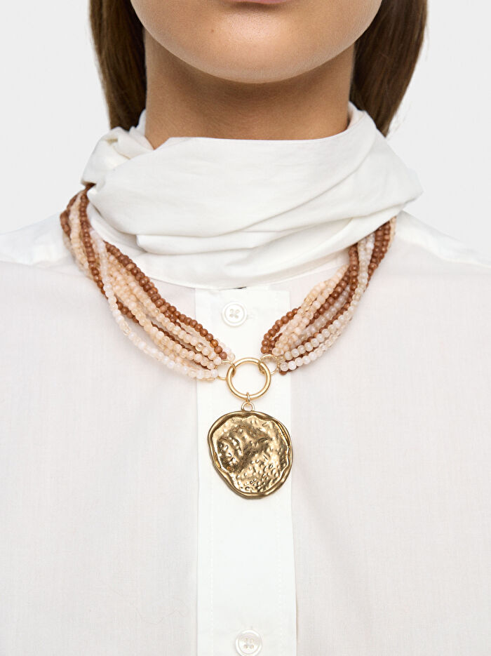 Taş efektli resin boncuklardan oluşan kısa çok sıralı kolye. Düzensiz yuvarlak kolye ucu, dövülmüş ve eskitilmiş yüzeyli.