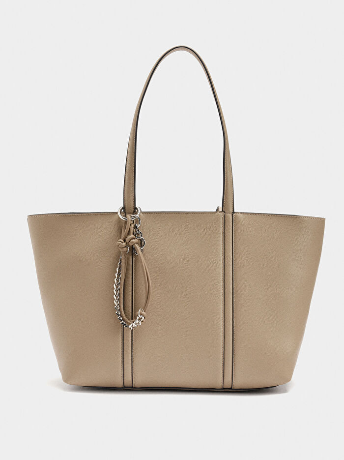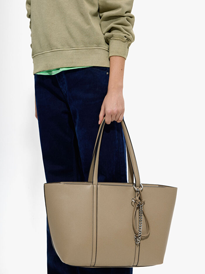 Dokulu büyük shopper çanta. İç astar. Fermuarlı kapatma. Çıkarılabilir zincirli askı. Sabit askılı omuz askıları.