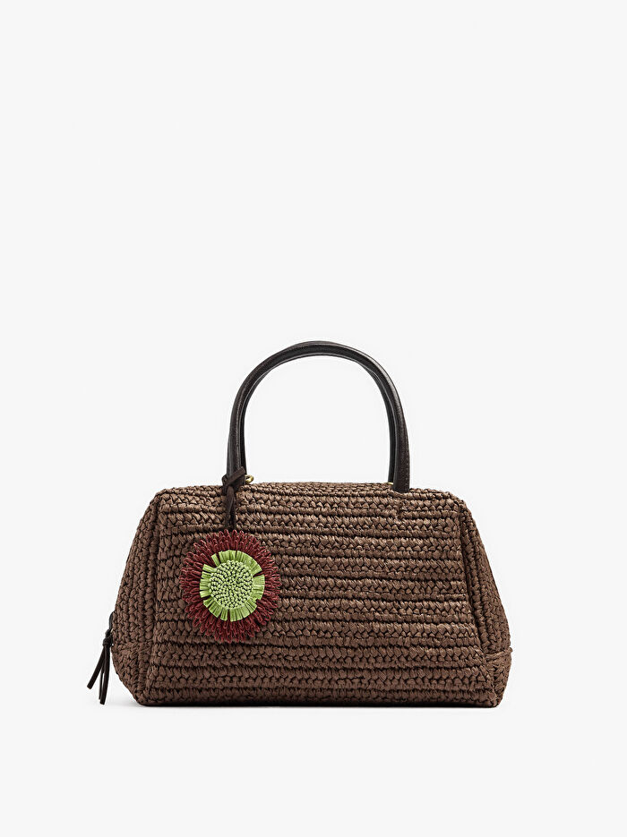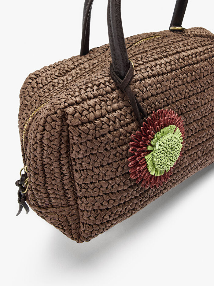 Hasır efektli orta boy bowling çanta. Çıkarılabilir çiçek şeklinde charm. İç astar. Fermuarlı kapatma. Sabit el askıları. Ayarlanabilir ve çıkarılabilir çapraz askılı çanta askısı içerir.