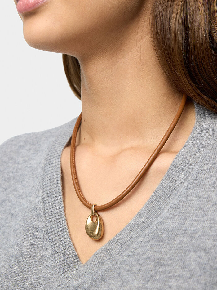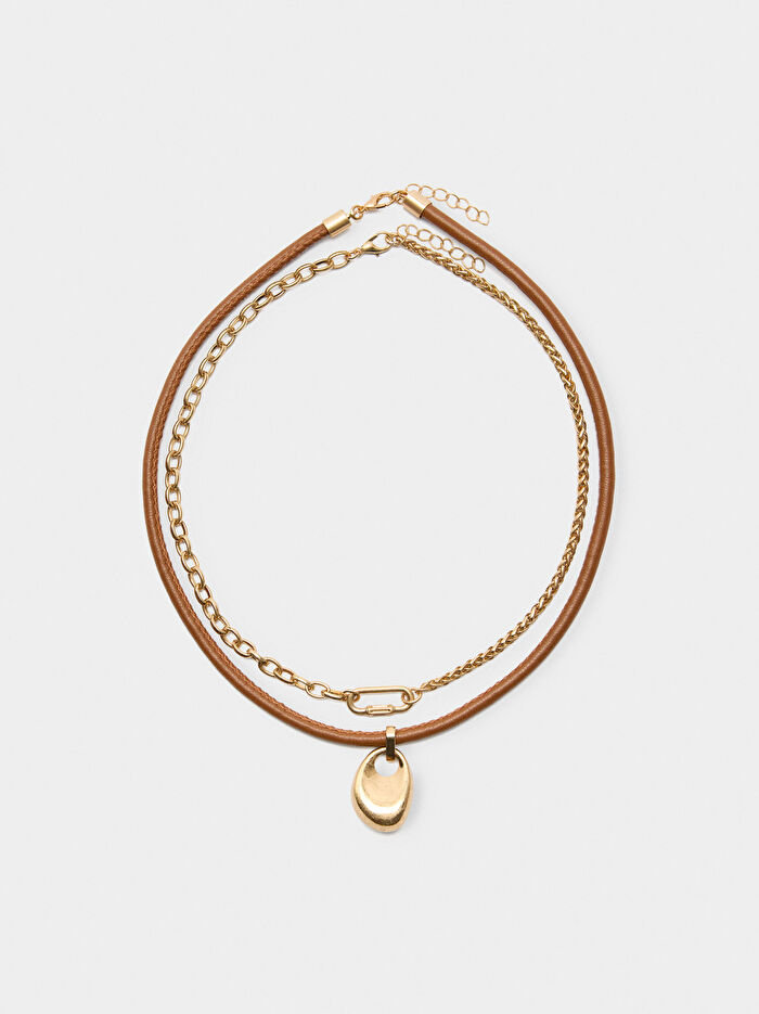İki kısa kolye seti: biri oval kolye ucu olan bir kordon; diğeri zincirli ve uzun halka kolye ucu olan bir kordon. Her ikisi de karides kancası kapamalı. Eskitme efektli.