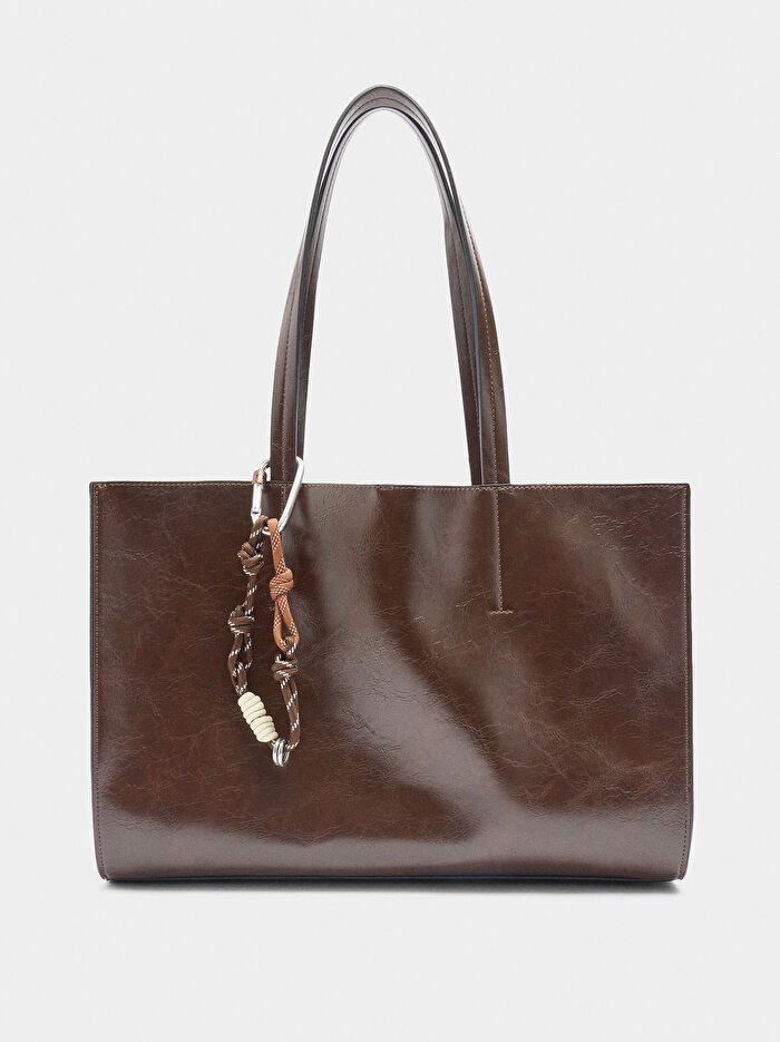 Yapay çatlak deri efektli shopper çanta. Astar ve iç cep. Çıkarılabilir charmlı. Kayış ve karabina kapama. Sabit omuz askıları.