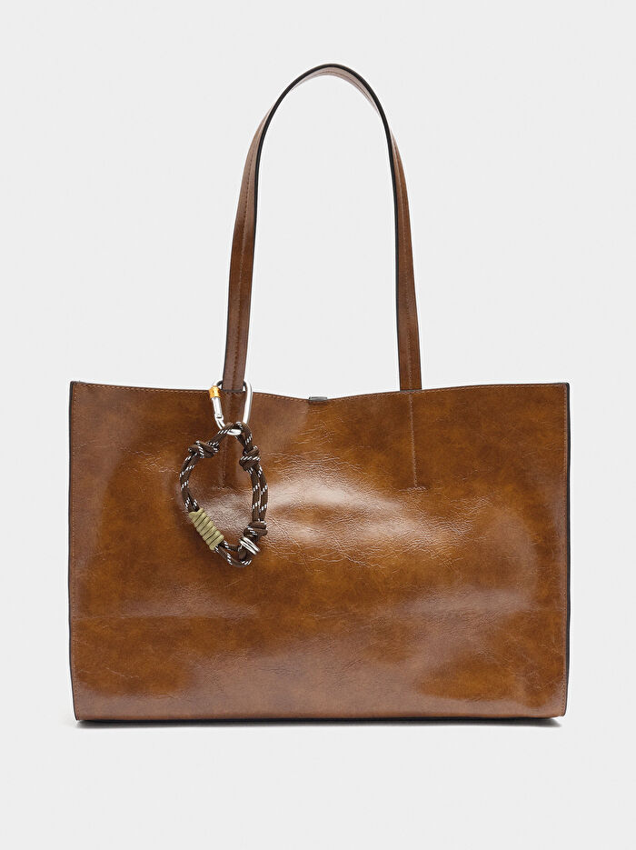 Çatlak efektli büyük shopper çanta. Astar ve iç cep. Istakoz kopçalı kapama. Çıkarılabilir charm Sabit omuz askıları.