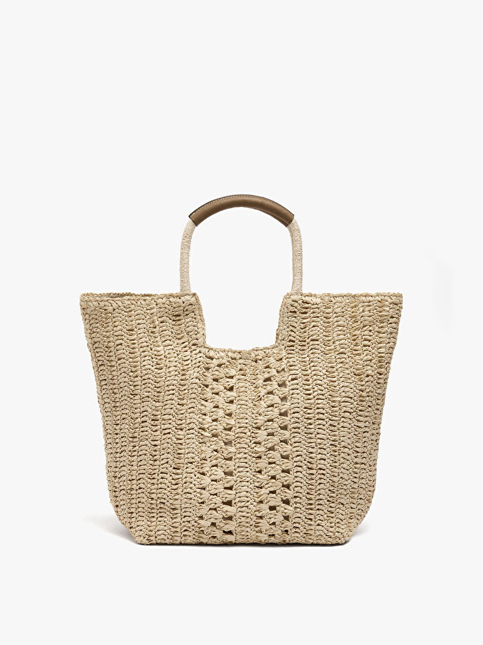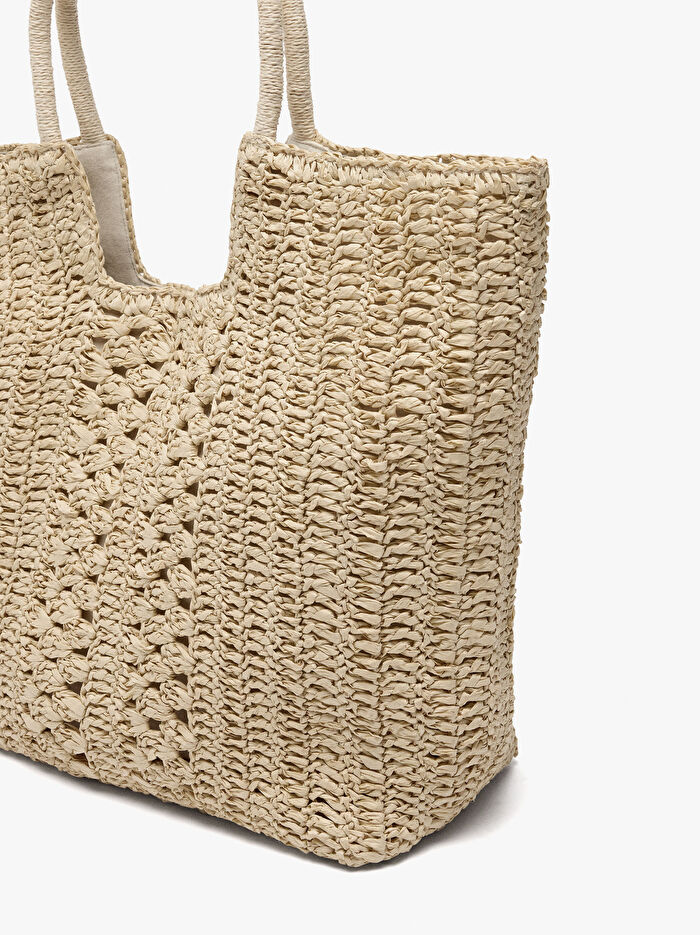 Kağıt hasır efektli örgülü büyük shopper çanta. Dikdörtgen şeklinde. Astar ve iç cep. Mıknatıslı kapatma. Sabit el askıları.