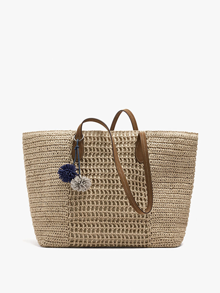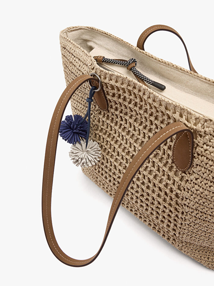 Hasır efektli örgülü shopper çanta. Çıkarılabilir ponpon charm. Kare şekil. Astar ve iç cep. Fermuarlı kapatma. Sabit omuz sapları.