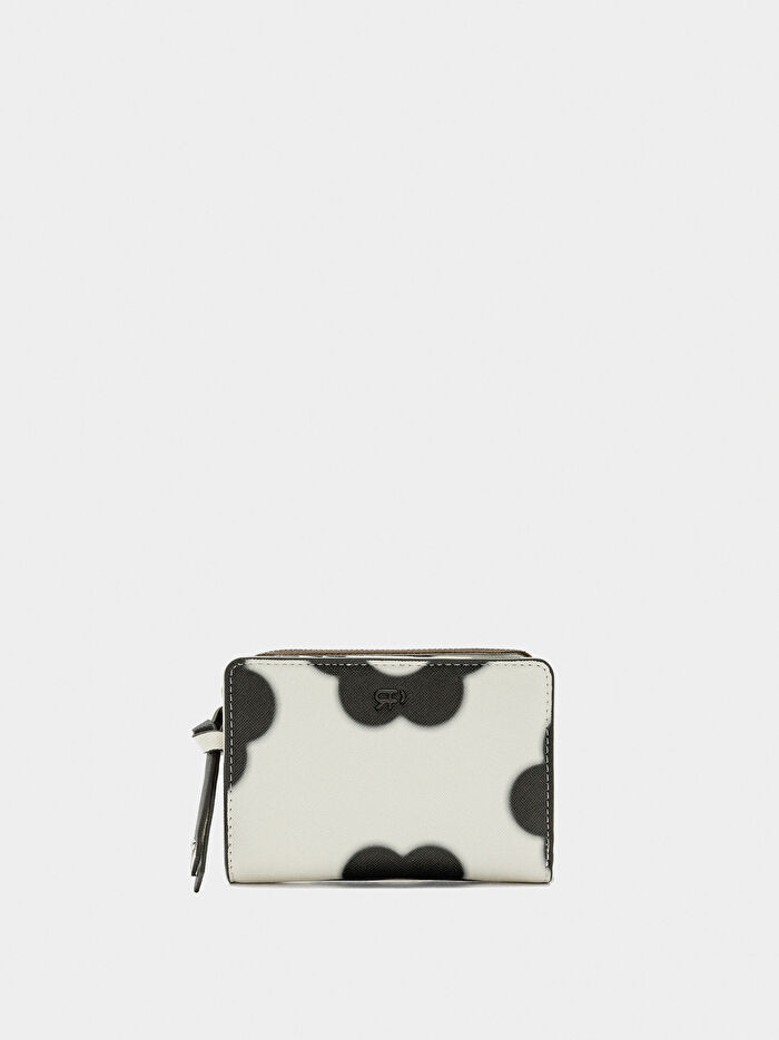 Çiçek desenli dokulu cüzdan. İç kısımda kart yuvaları ve fatura bölmeleri; yan kısımda çıtçıtlı kapaklar. Fermuarlı bozuk para bölmesi.