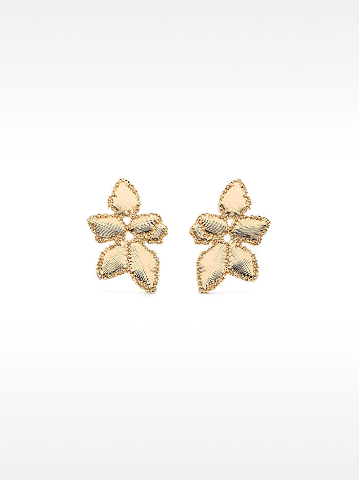 Dokulu, orta boy çiçek şekilli küpe. Altın kaplama.