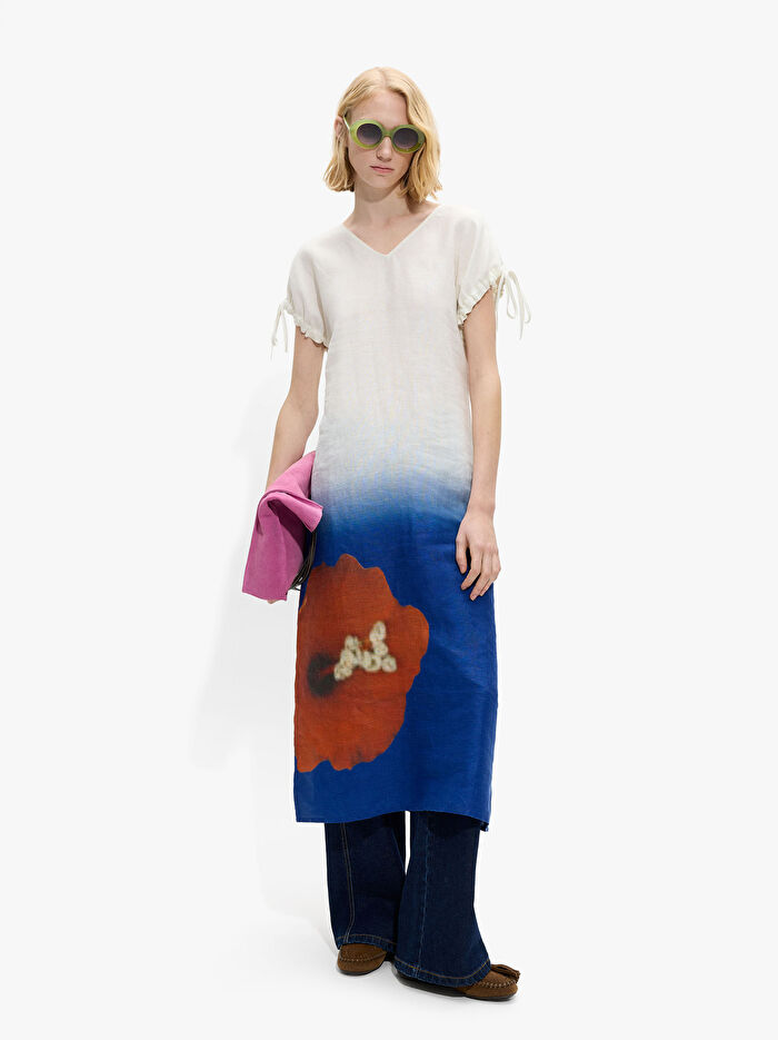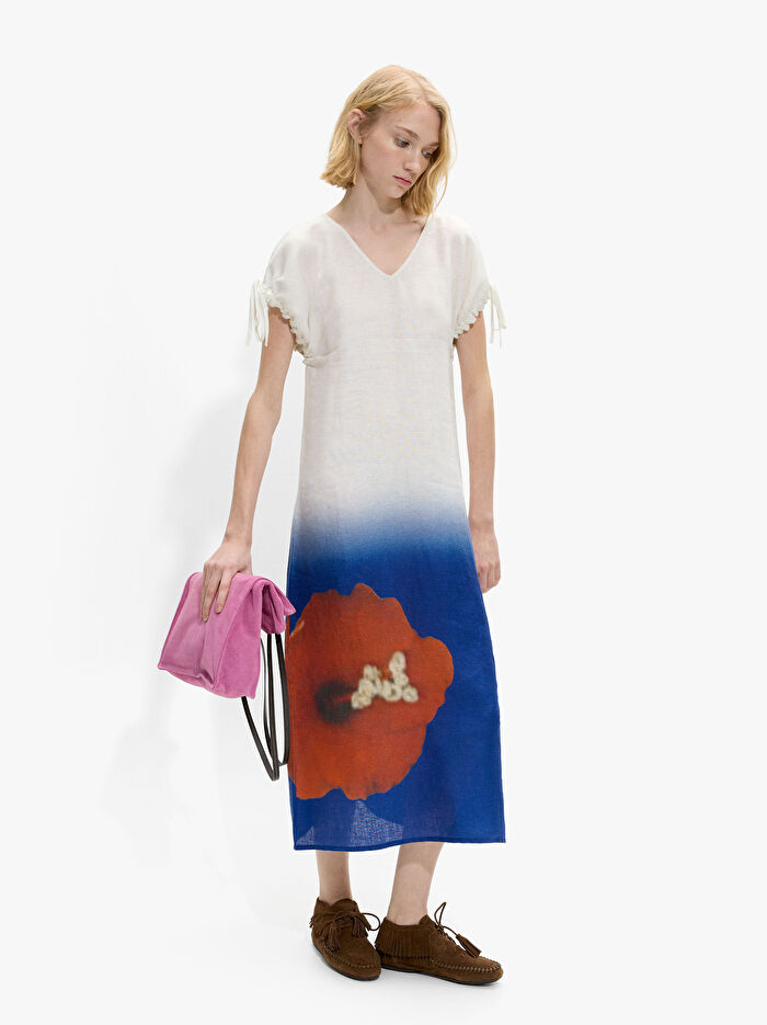 Alt kısmında çiçek desenli midi elbise. %100 keten kumaştan üretilmiştir. V yakalı. Büzgülü detaylı düşük omuzlu. Model 1,78 m boyunda ve S beden giymektedir.