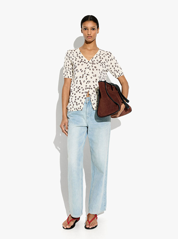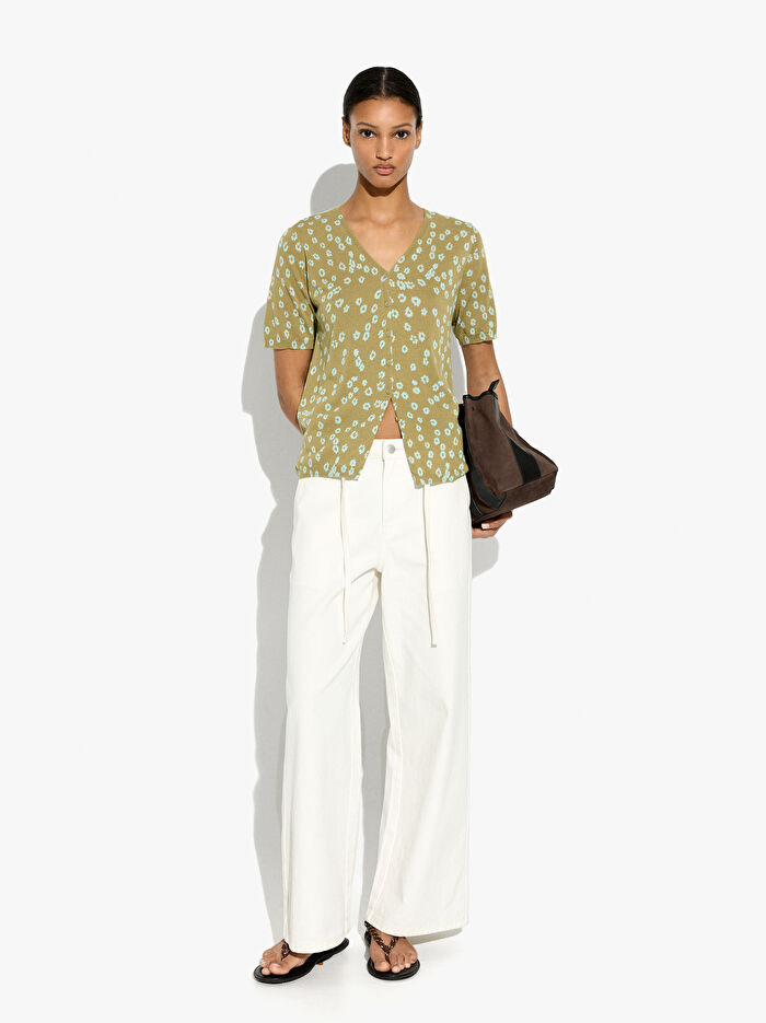 Çiçek desenli örgü hırka. V yakalı. Kısa kollu. Düğmeli. Model 1,78 m boyunda ve XS-S beden giyiyor.