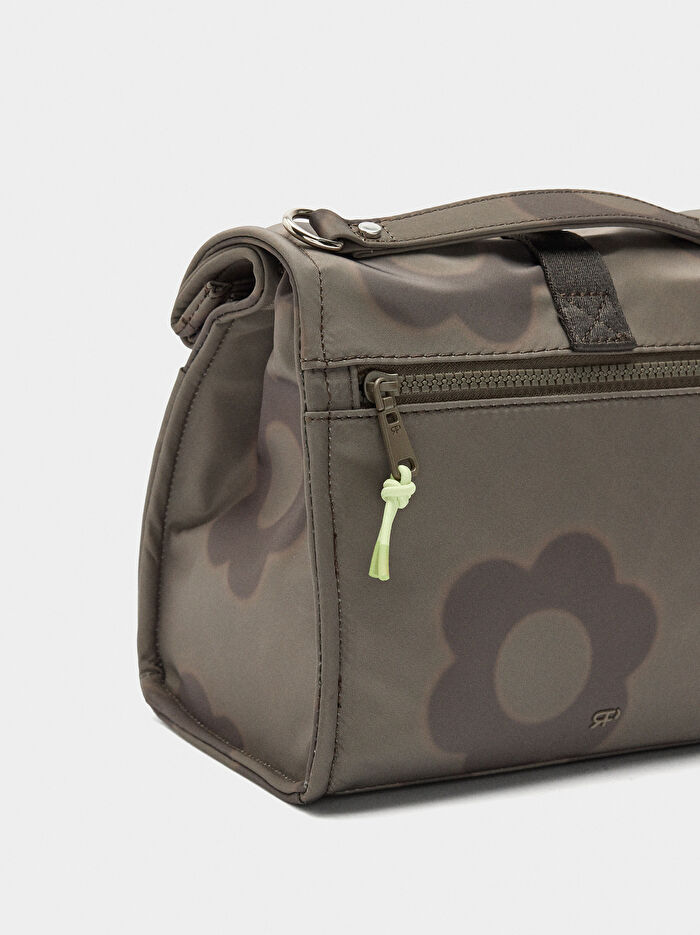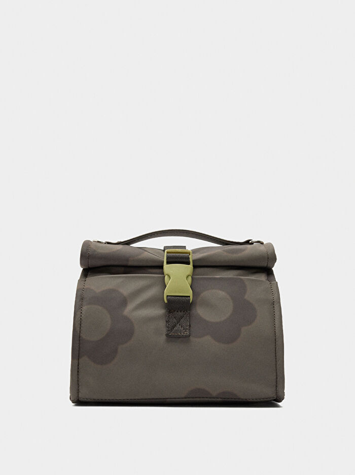 Çiçek desenli teknik kumaş öğle yemeği çantası. Kontrast renkli şerit detayı. Arka kısımda fermuarlı cep. Sabit el askısı. Ayarlanabilir ve çıkarılabilir çapraz askı. Plastik klips tokalı ana kapak. Isı yalıtımlı iç kısım.