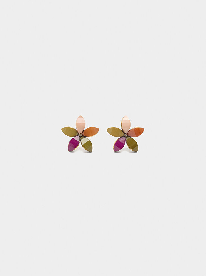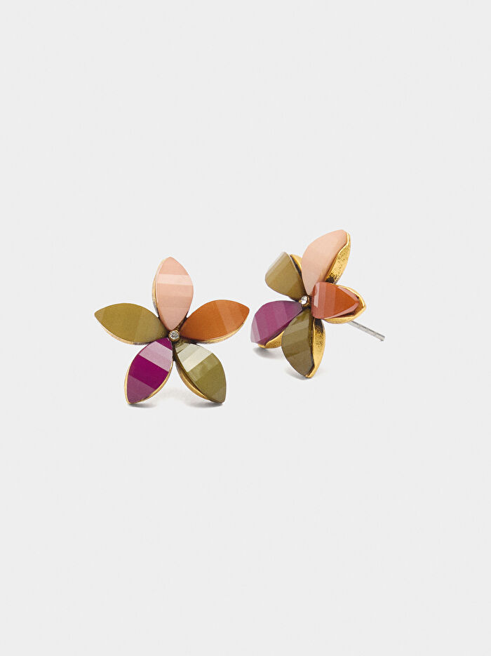 Çiçek şeklinde tek renkli resin küpeler. Ortasında parlak cam detay.