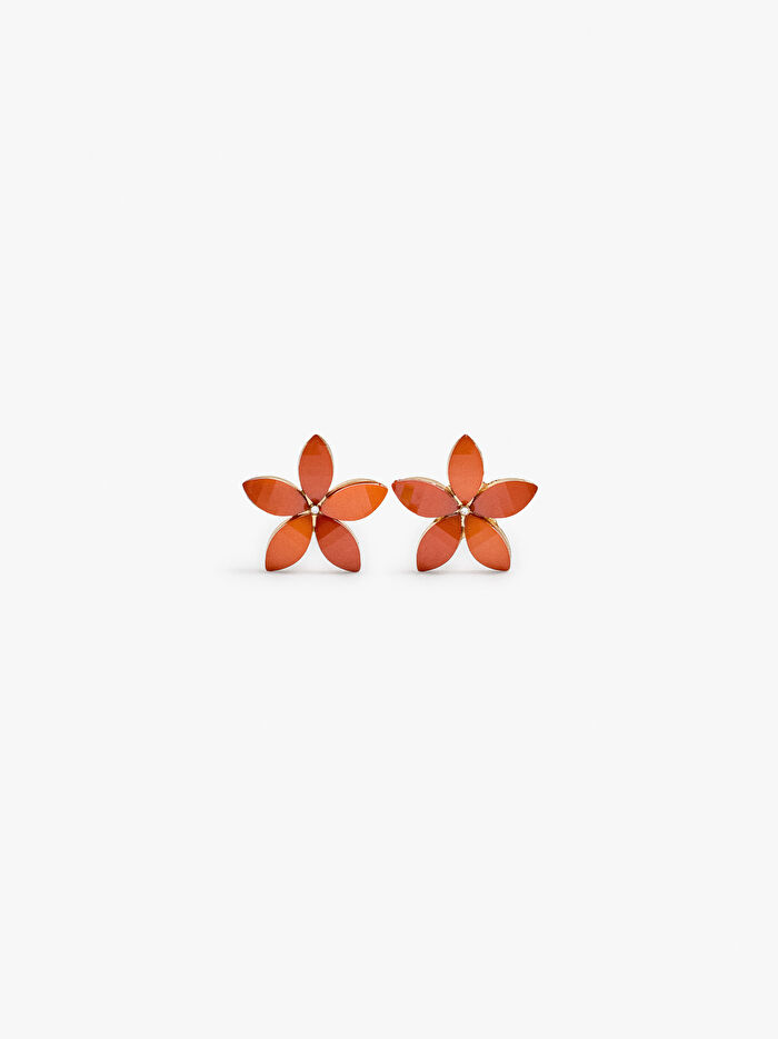 Tek renk, çiçek şeklinde resin küpe. Ortasında parlak cam detayı.