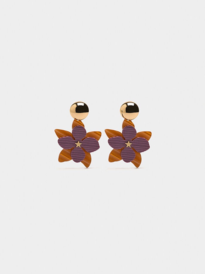 Desenli ve kontrast renkli çift çiçek şeklinde uzun küpe. Yuvarlak metal taban.