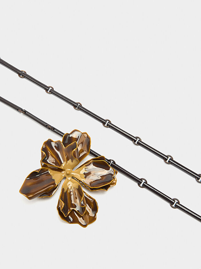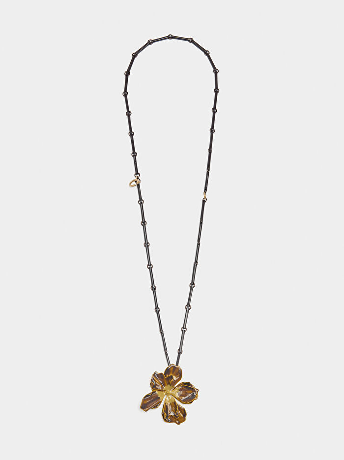 Parçalı metal çubuklardan oluşan uzun kolye. Kısa kolye olarak da takılabilir. Kabartma detaylı ve mine işlemeli çiçek şeklinde kolye ucu.