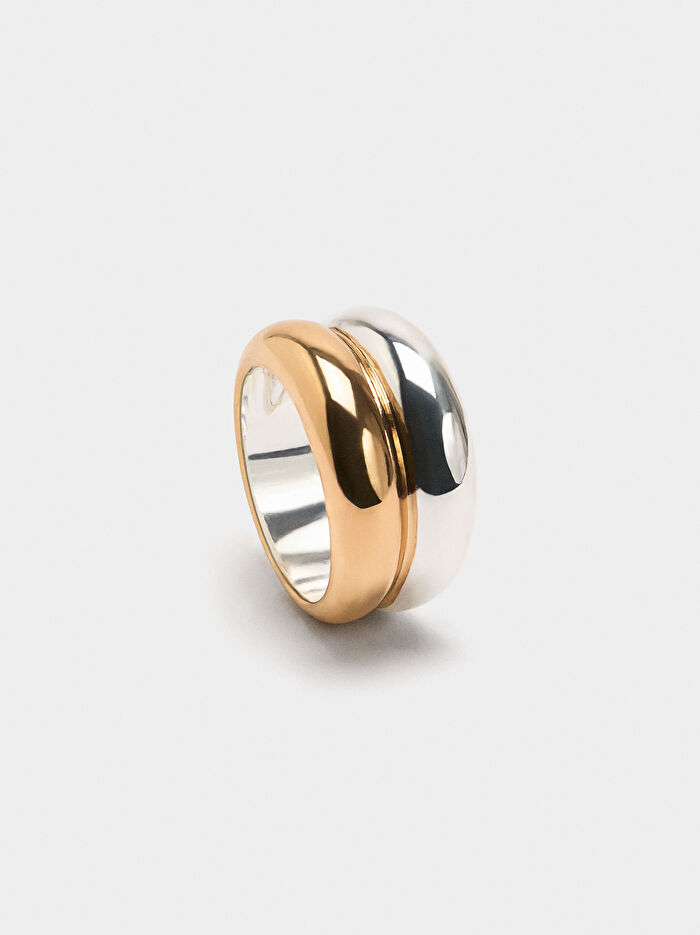 Çift renkli düz yüzük. Yuvarlak şekilli. Gümüş ve parlak.