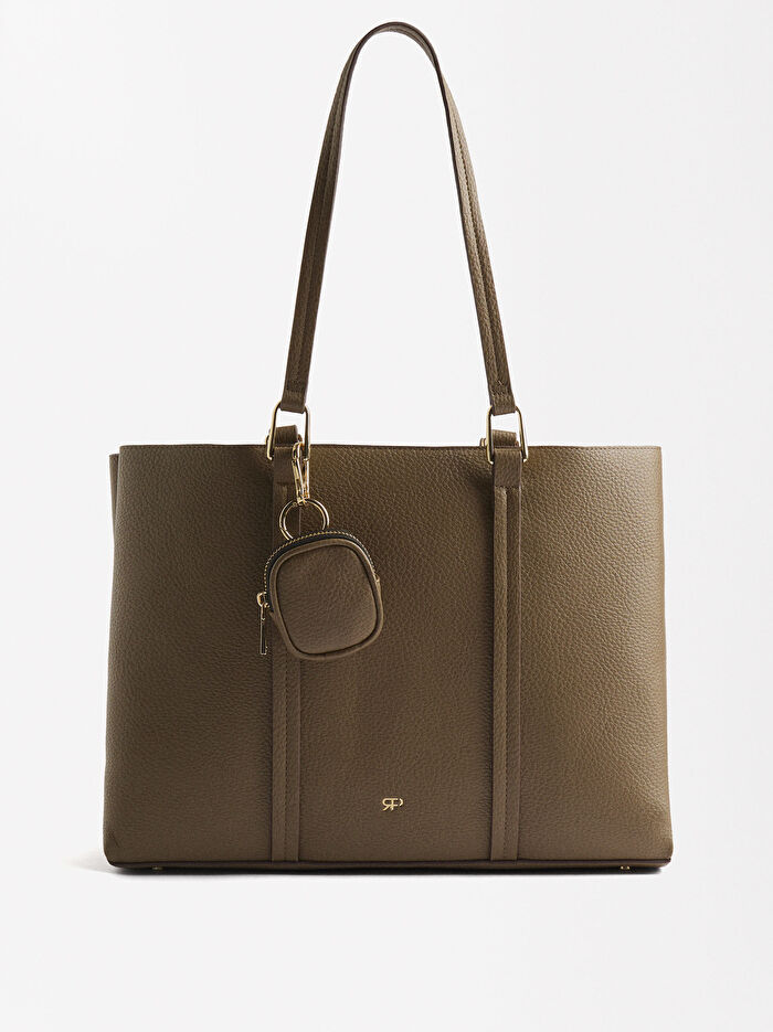 Sabit çift saplı büyük shopper çanta. El tutacakları ve omuz askıları. İç astar. Fermuarlı orta bölme. Çıkarılabilir aksesuar.