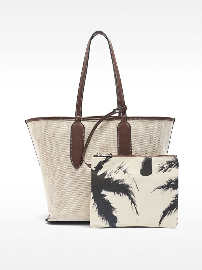 Ters çevrilebilir kumaş alışveriş çantası. Palmiye ağacı baskılı. Fermuarlı, çıkarılabilir asma tipi iç cep. Sabit omuz askıları.