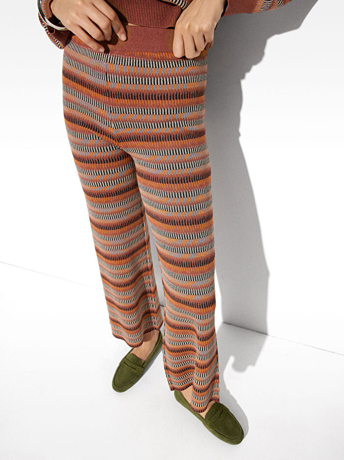 Jakarlı çizgili triko pantolon. Elastik, ribana kenarlı bel bandı. Model 1.77 m boyunda olup XS-S beden giymektedir.