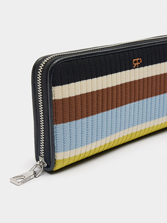 Büyük çizgili örme cüzdan. Nervürlü doku. Kartlar ve kağıt paralar için çoklu kart yuvaları. Bozuk para bölmesi. Fermuarlı kapak.