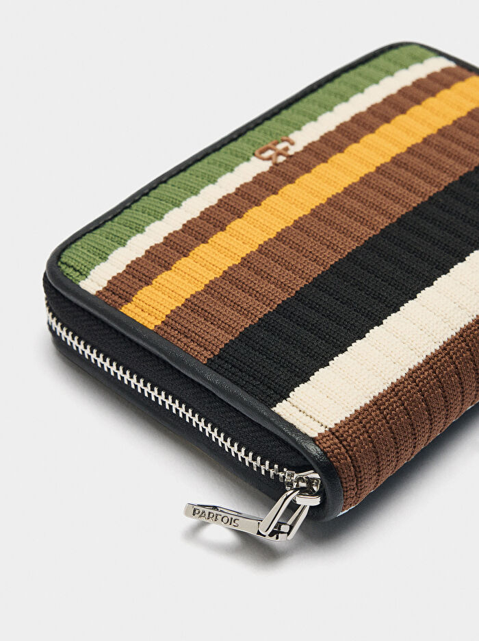 Çok renkli çizgili küçük örgü cüzdan. Nervürlü doku. Kart yuvaları ve fatura yuvaları. Bozuk para bölmesi. Fermuarlı kapama.