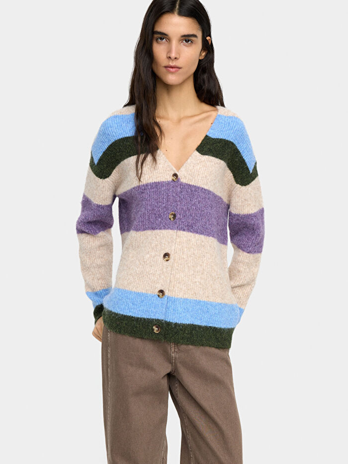 Çizgili örme hırka. V yakalı. Uzun kollu. Düğme kapamalı. Model 1,78 m boyunda ve XS-S beden giyiyor.