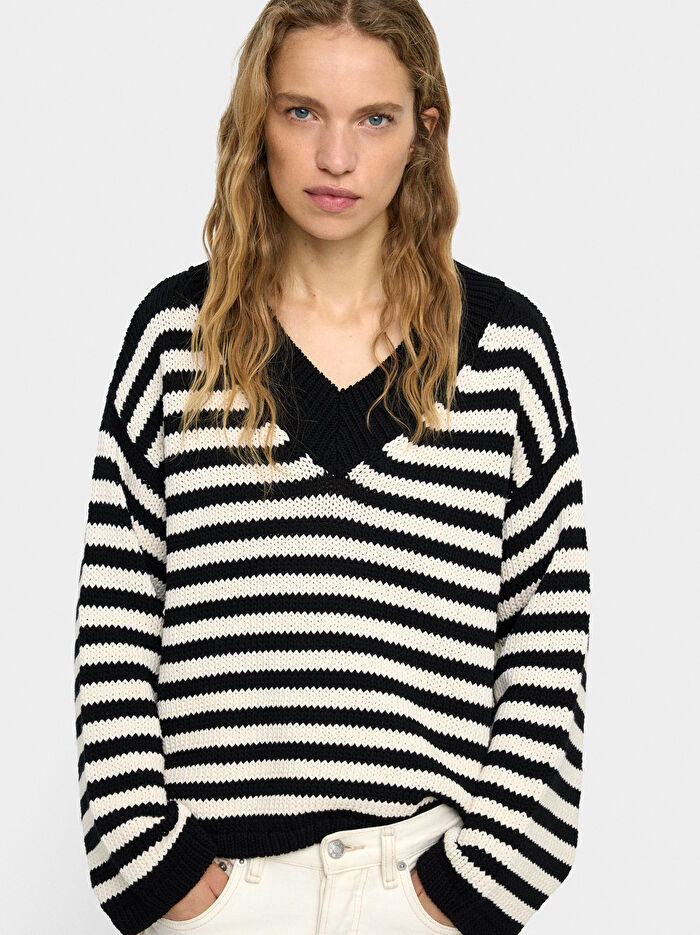 Pamuk karışımlı çizgili örme kazak. V yakalı. Uzun kollu. Ribana kenarlı. Model 1,77 m boyunda ve XS-S beden giyiyor.