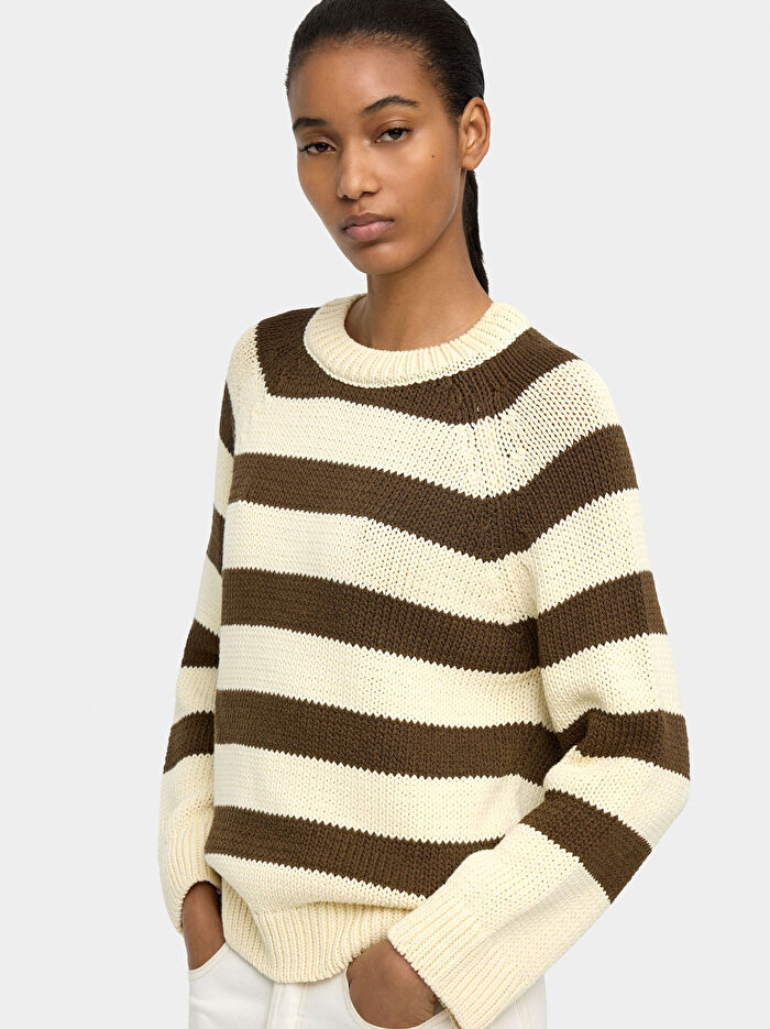 Çizgili örme kazak. Pamuk karışımı. Yuvarlak yaka. Uzun kollu. Model 1,76 m boyunda ve XS-S beden giyiyor.