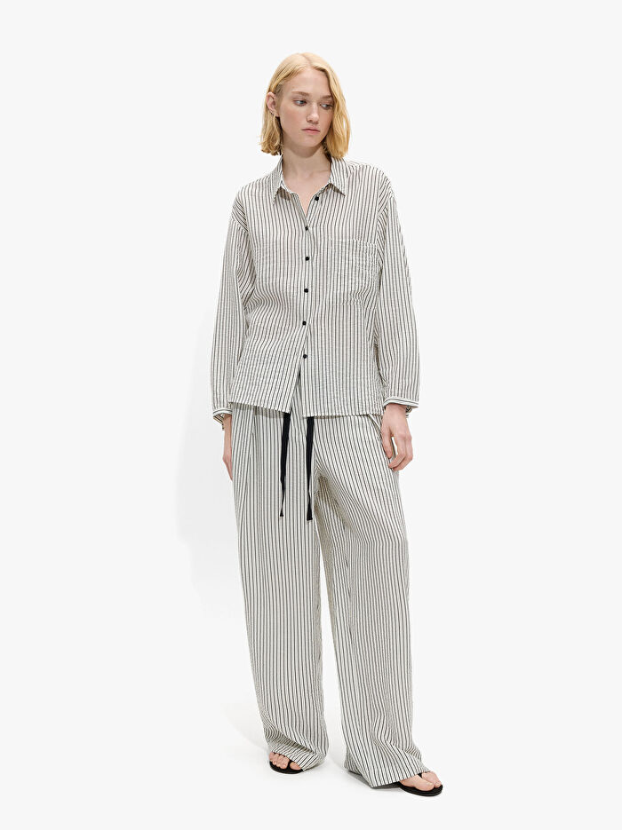 Çizgili düz paça pantolon. Ayarlanabilir ipli bel. Yan cepler. Ön pileler. Model 1.78 m boyunda ve S beden giymektedir.