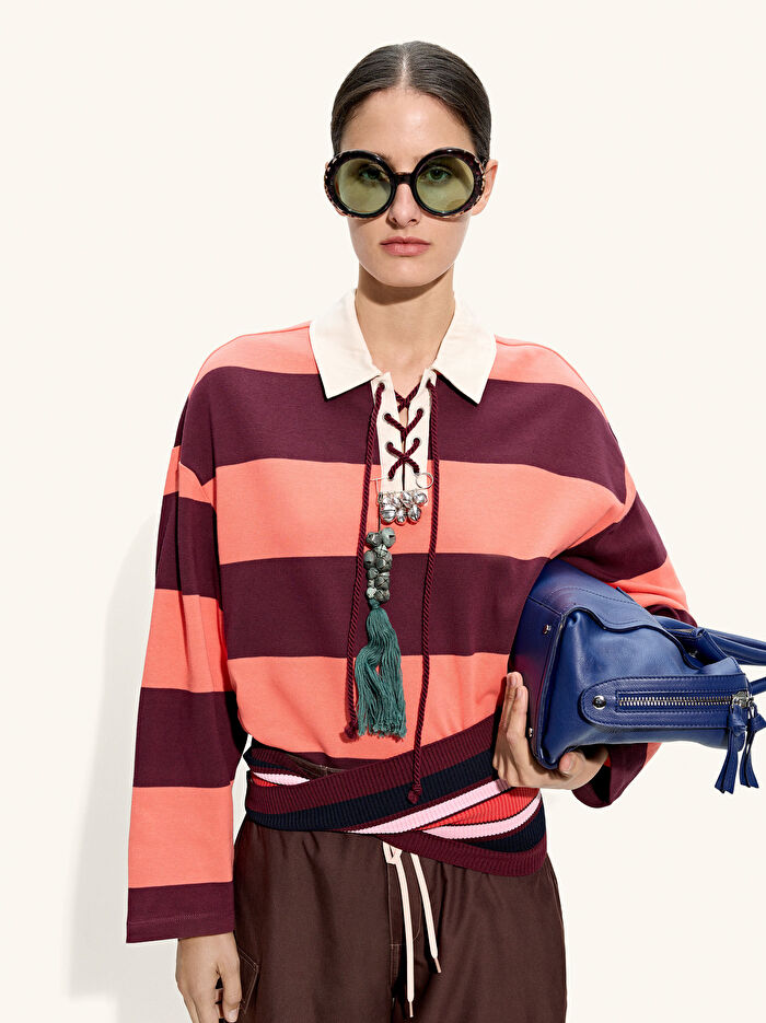 Kontrast renkli şeritli sweatshirt. %100 pamuktan üretilmiştir. Yaka yakalı. Çapraz bağcıklı V yakalı. Uzun kollu. Model 1,78 m boyunda ve XS-S beden giyiyor.
