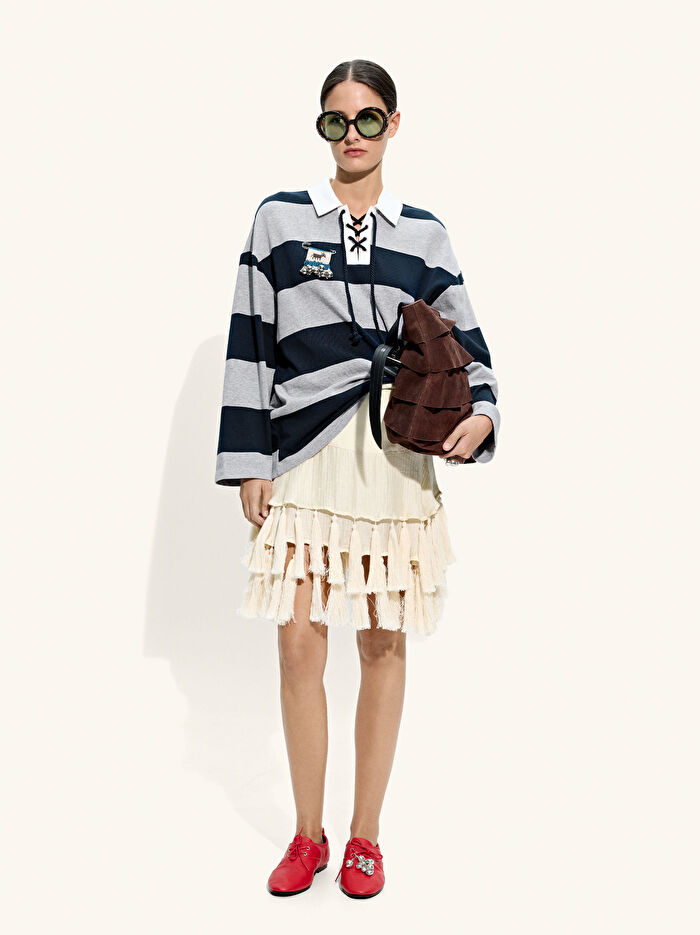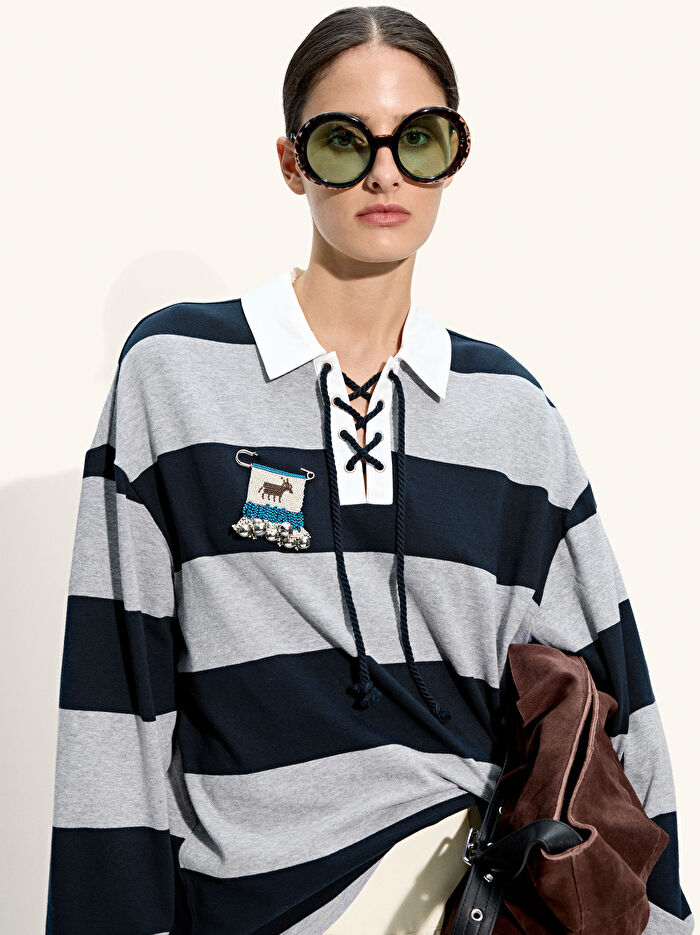 Kontrast renkli şeritli sweatshirt. %100 pamuktan üretilmiştir. Yaka yakalı. Çapraz bağcıklı V yakalı. Uzun kollu. Model 1,78 m boyunda ve XS-S beden giyiyor.