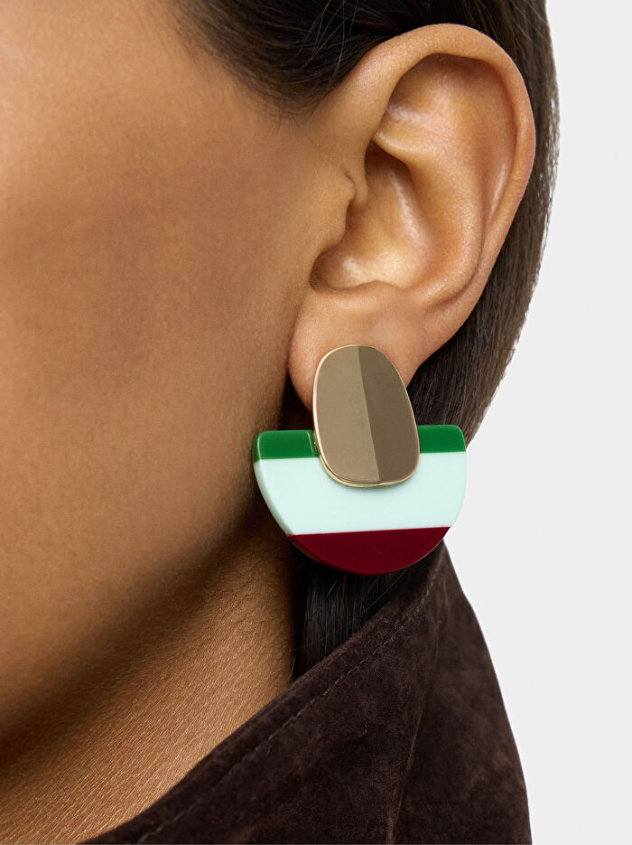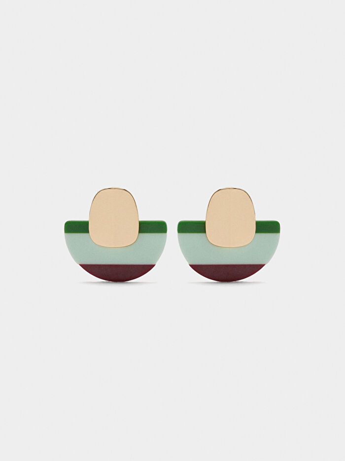 Çizgili reçineli yarım daire şeklinde orta boy küpe. Oval metal taban.
