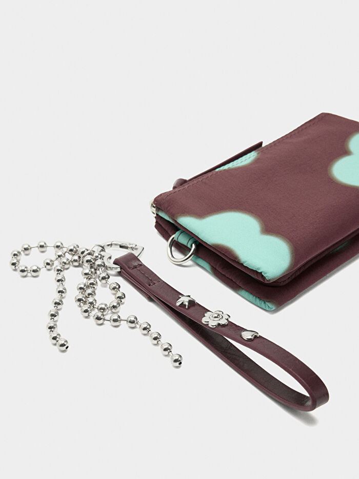 Çiçek desenli teknik kumaş çok amaçlı çanta. Orta boy. İç astar. Fermuarlı kapaklar. Zımba detaylı ve metal boncuklu fiyonk detaylı çıkarılabilir bilek kayışı.
