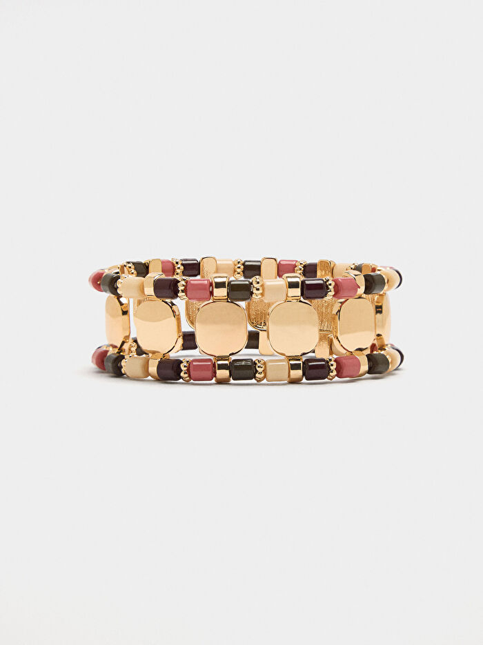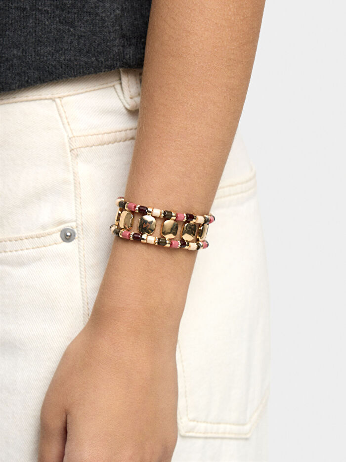 İki sıra çok renkli boncuklu, yapısal elastik bileklik. Eskitme ve dövme efekti.