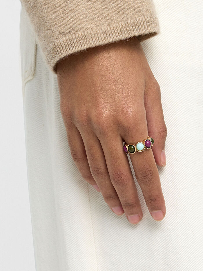 Reçineden yapılmış çok renkli yuvarlak taşlı yüzük. Metal kenar.