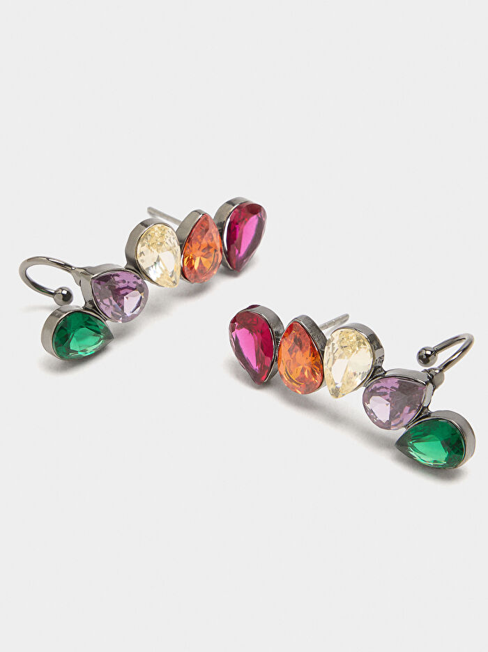 Damla şeklinde, çok renkli fasetli zirkonlara sahip ear jacket küpeler. Koyu ve parlak gümüş bitiş.