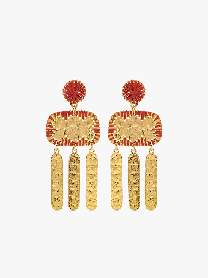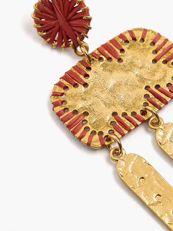 Rafya efektli, yuvarlak örme tabanlı uzun küpeler. Kenarları örme dikdörtgen sarkıt. Çekiçlenmiş efektli çubuk şeklindeki sarkıtlar.