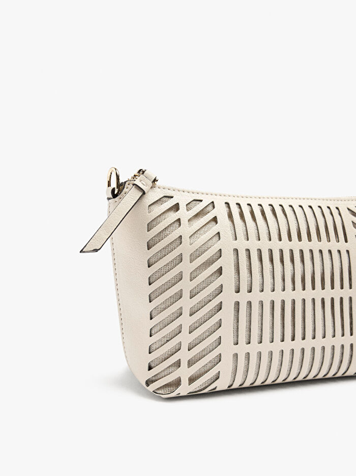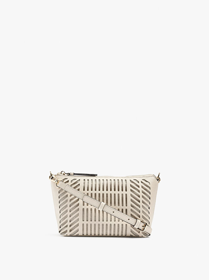 Dikey ve çapraz delikli çapraz askılı çanta. Astarlı ve iç cepli. Fermuarlı. Ayarlanabilir ve çıkarılabilir çapraz askı.