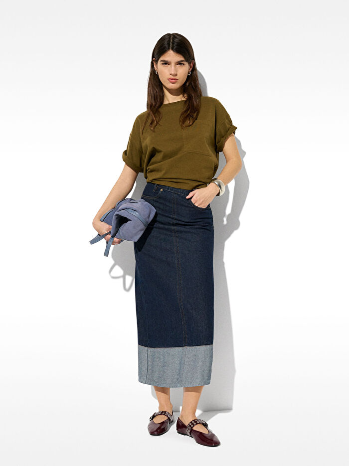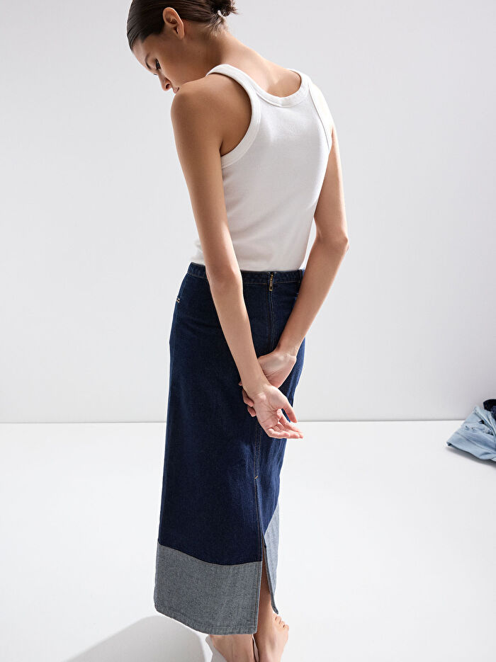 Midi denim etek. A-kesim. Ön ve yan cepli. Arkası fermuarlı. Yan alt yırtmaçlı. Etek ucu kontrast kenarlı. Model 1.77 m boyunda olup 34 beden giymektedir.