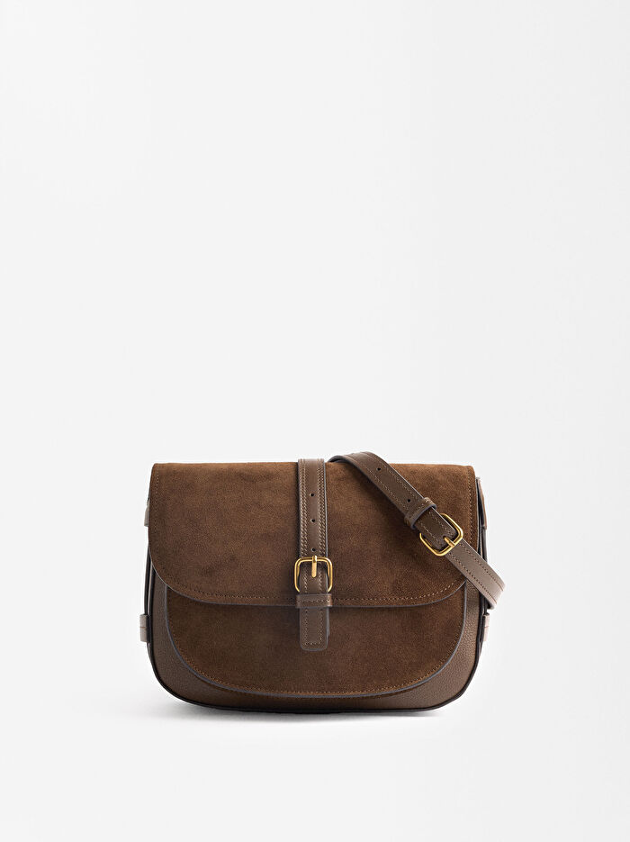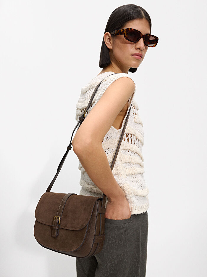 Kapaklı ve tokalı, deri omuz çantası. İç, dış ve arka cepleri mevcut. Fermuarlı. Ayarlanabilir sabit askı.