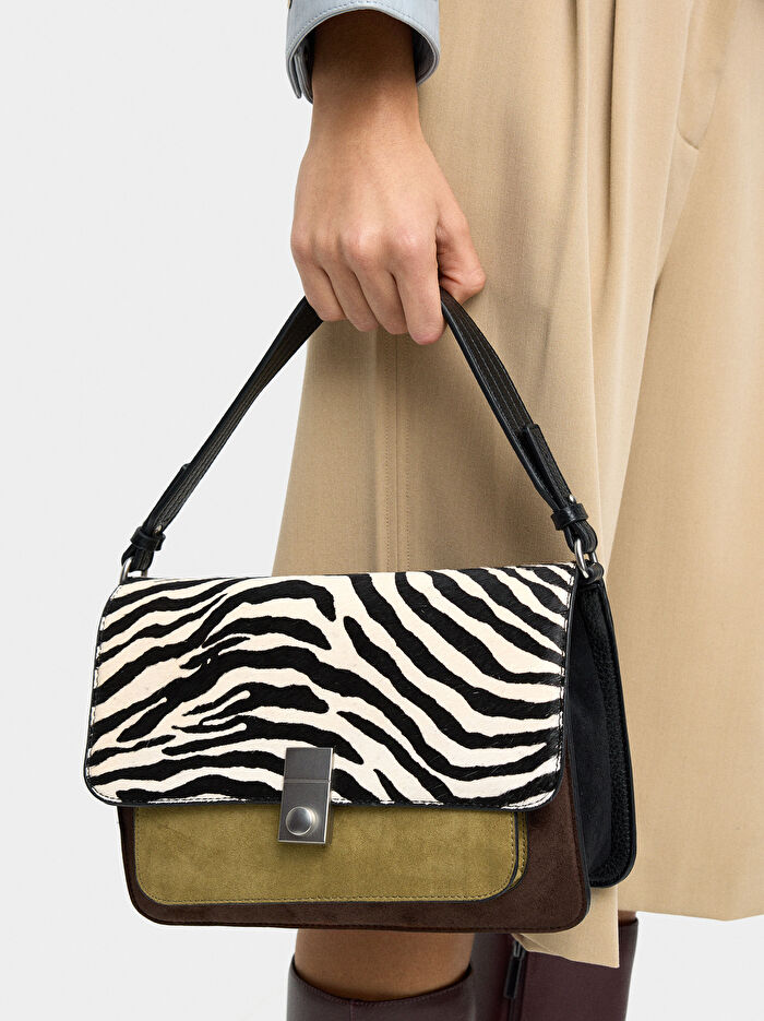 Hayvan desenli deri detaylı çapraz askılı çanta. Orta boy. Astar ve iç cep. Manyetik kapak. Sabit bilek kayışı. Ayarlanabilir ve çıkarılabilir çapraz askı kayışı.