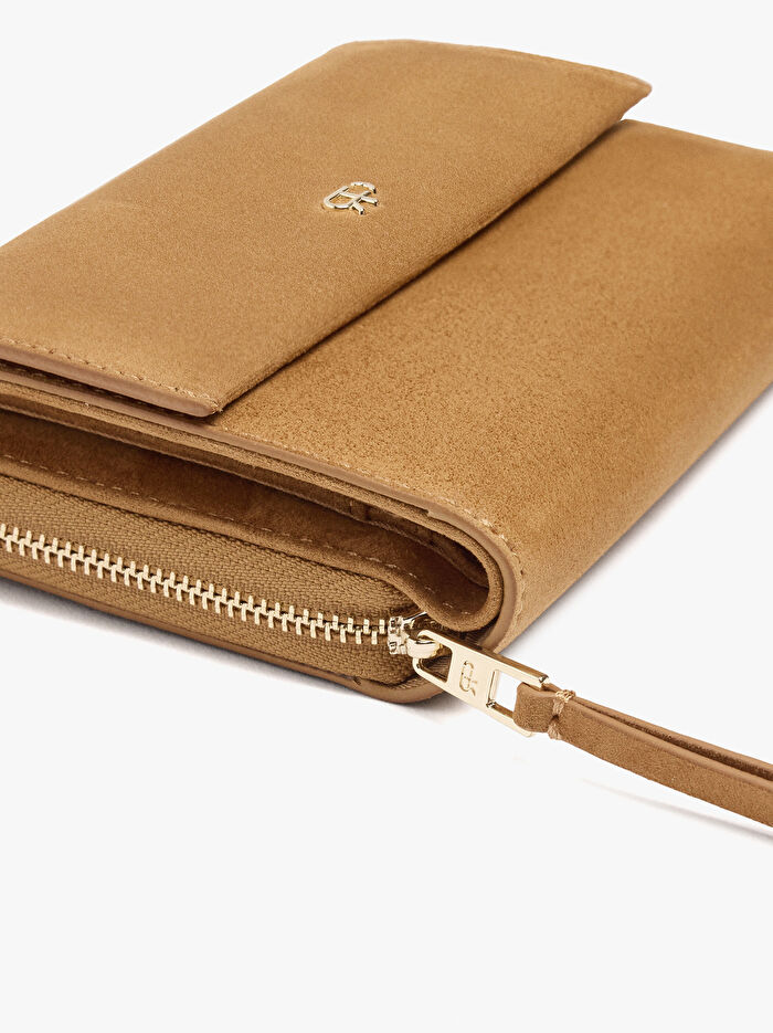Deri efektli küçük cüzdan. Kart yuvaları ve kağıt para bölmeli iki bölme: biri kapaklı ve çıtçıtlı düğmeli; diğeri fermuarlı ve bozukluk bölmeli.