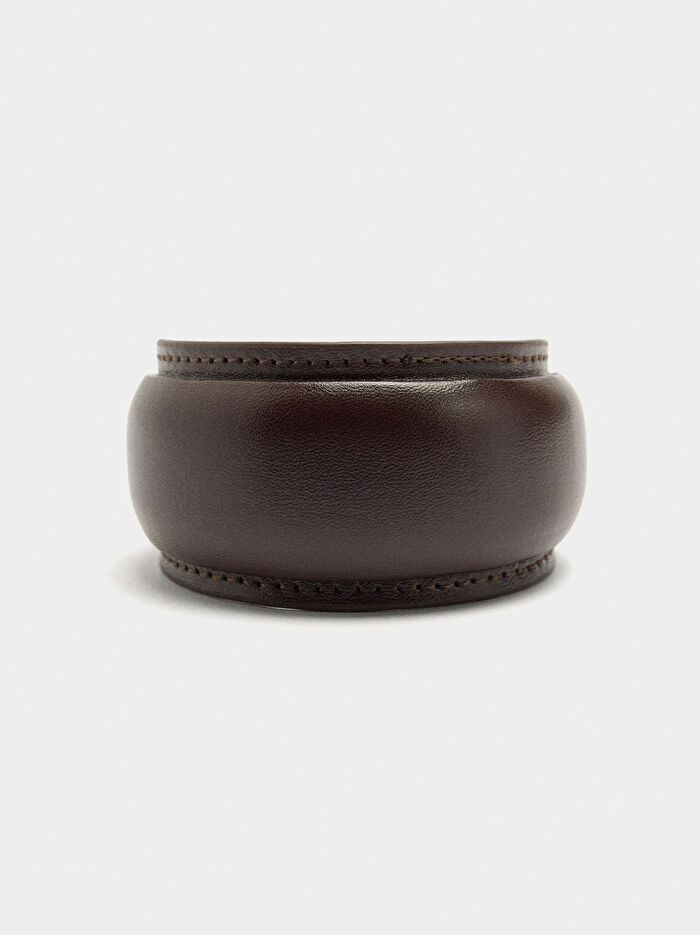 Deri görünümlü ve zarif kabartma detaylı, sert bileklik, her görünüme modern ve şık bir dokunuş katmak için tasarlandı.