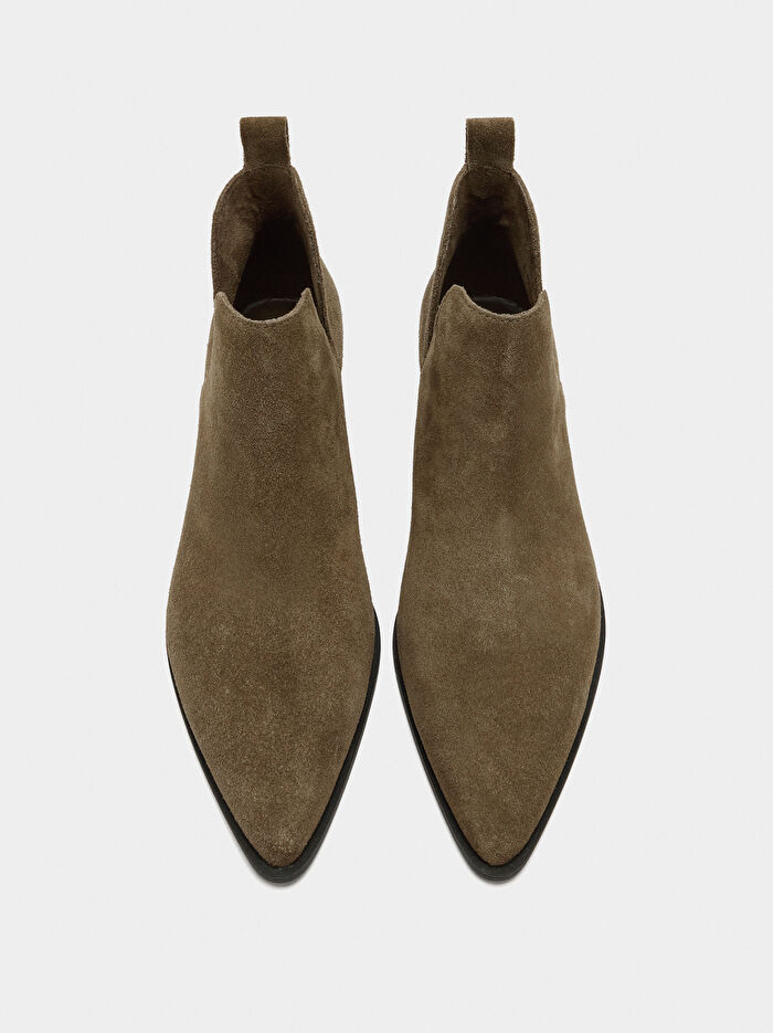 Süet kovboy çizmeleri, blok topuklu. Yan açıklıklar. Arka çekme halkaları. Sivri burun. Termoplastik poliüretan taban. Topuk yüksekliği: 4 cm.