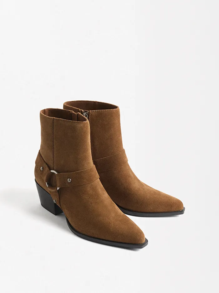 Halkalı ve zımba detaylı deri bot. Sivri burunlu. İç kısımda yandan fermuar kapatmalı. Kauçuk taban. Topuk yüksekliği: 5 cm.