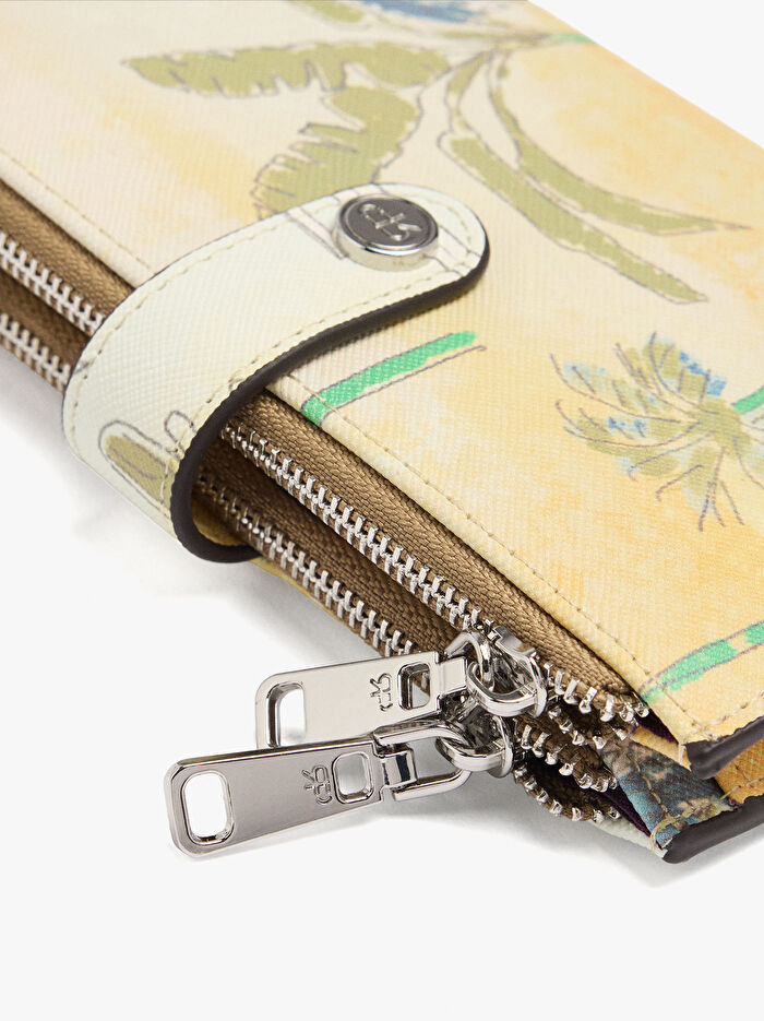 Dokulu baskılı cüzdan. Orta boy. Kart yuvaları ve kağıt para bölmesi. Çıtçıtlı düğme ile kapanır. Fermuarlı bozuk para bölmesi.