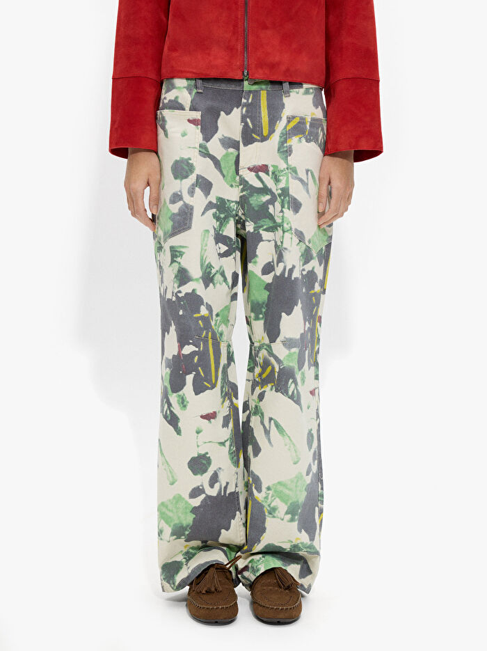 Desenli denim pantolon. Yıpranmış efekt. %100 pamuktan üretilmiştir. Geniş paça stili. Ön ve arka cepler. Düğme ve fermuarlı yırtmaç. Model 1,79 m boyunda ve 38 beden giymektedir.