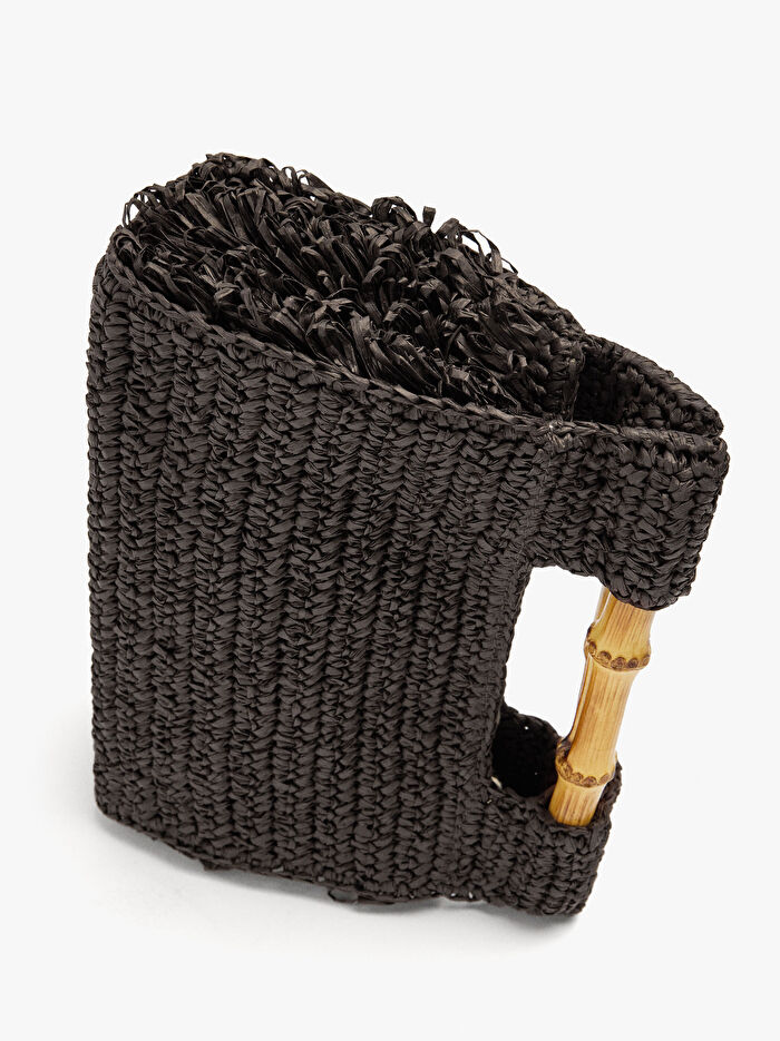 Kare şekilli, kağıt hasırdan yapılmış küçük el çantası. İç astarlı. Manyetik kapama. Bambu çubuklu sabit askı. Çıkarılabilir zincir askı dahildir.