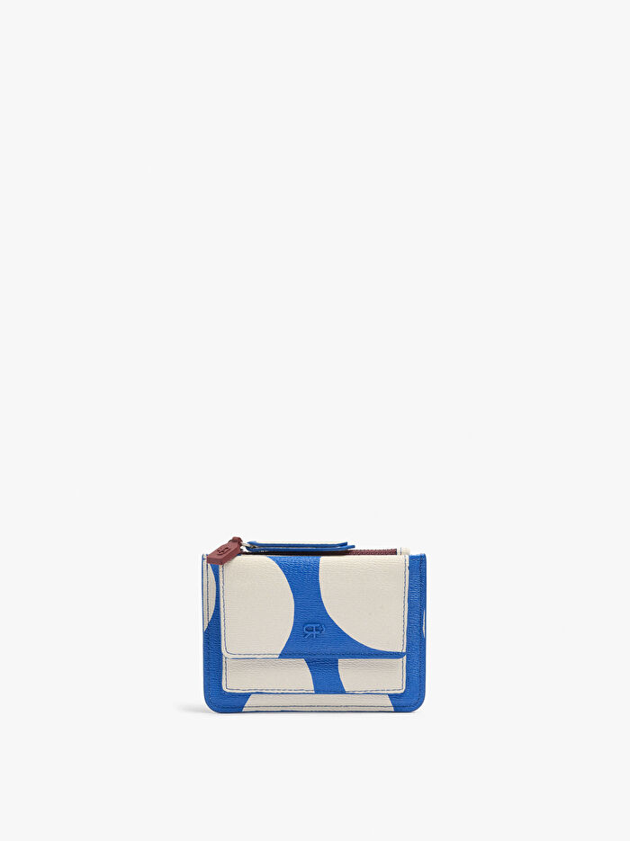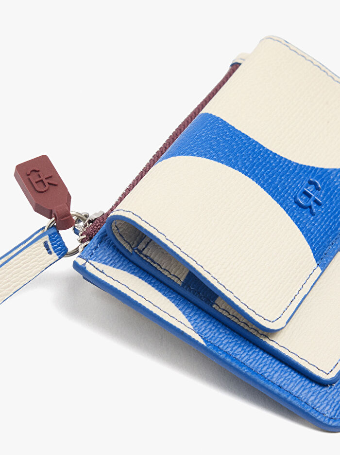 Dokulu ve desenli kartlık. Kart yuvaları. Fermuarlı orta bölme. Kapaklı dış cep.
