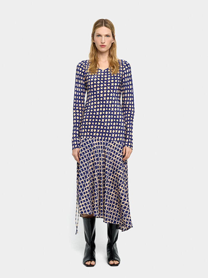 Daire desenli midi elbise. Asimetrik kesim. Bir tarafında askılı büzgülü. V yakalı. Uzun kollu. Model 1,80 m boyunda ve M beden giyiyor.